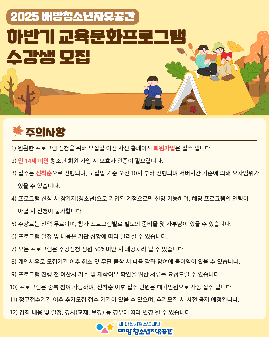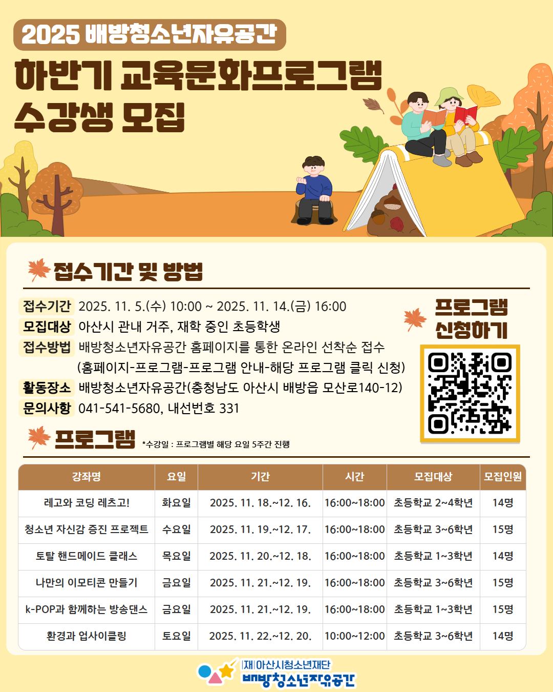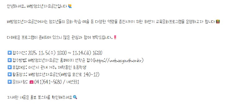 2025 배방청소년자유공간 하반기 교육문화프로그램 수강생 모집