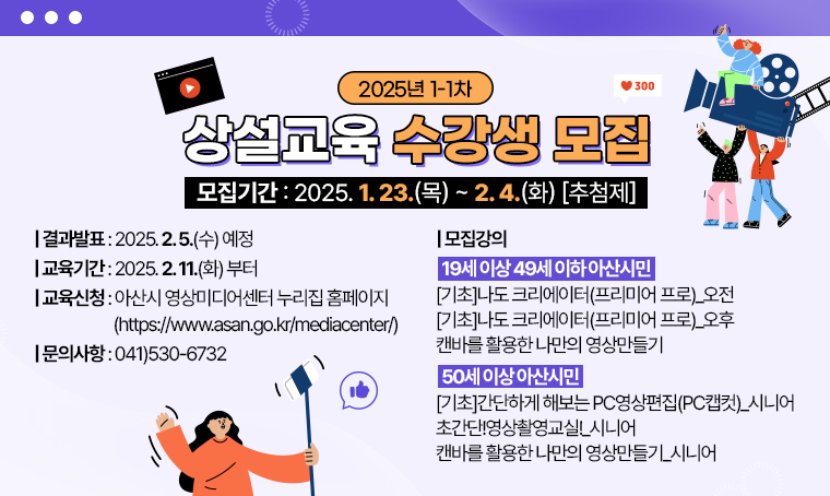 아산시 영상미디어센터에서 2025년 1-1차 상설교육 수강생을 모집합니다.