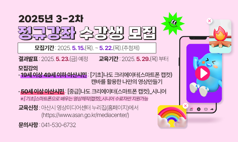아산시 영상미디어센터에서 2025년 3-2차 상설교육 수강생을 모집합니다.