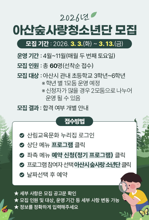 [초등 3학년] 2026년 아산숲사랑청소년단 모집