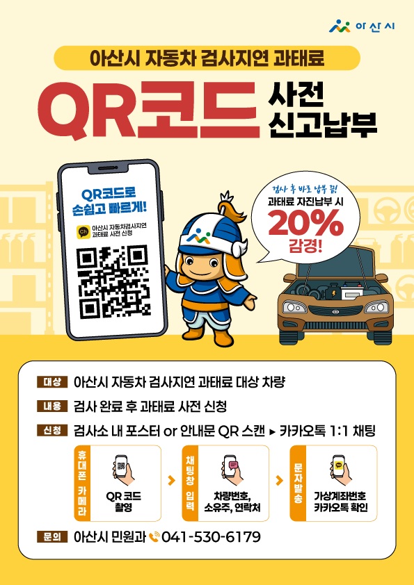 검사소 내 QR코드 스캔 또는 카카오 채널(채널명: 아산시 자동차검사지연과태료 사전 신청)을 통해 검사 즉시 납부 신청하는 서비스로 아산시에 등록된 차량만 신청할 수 있습니다.