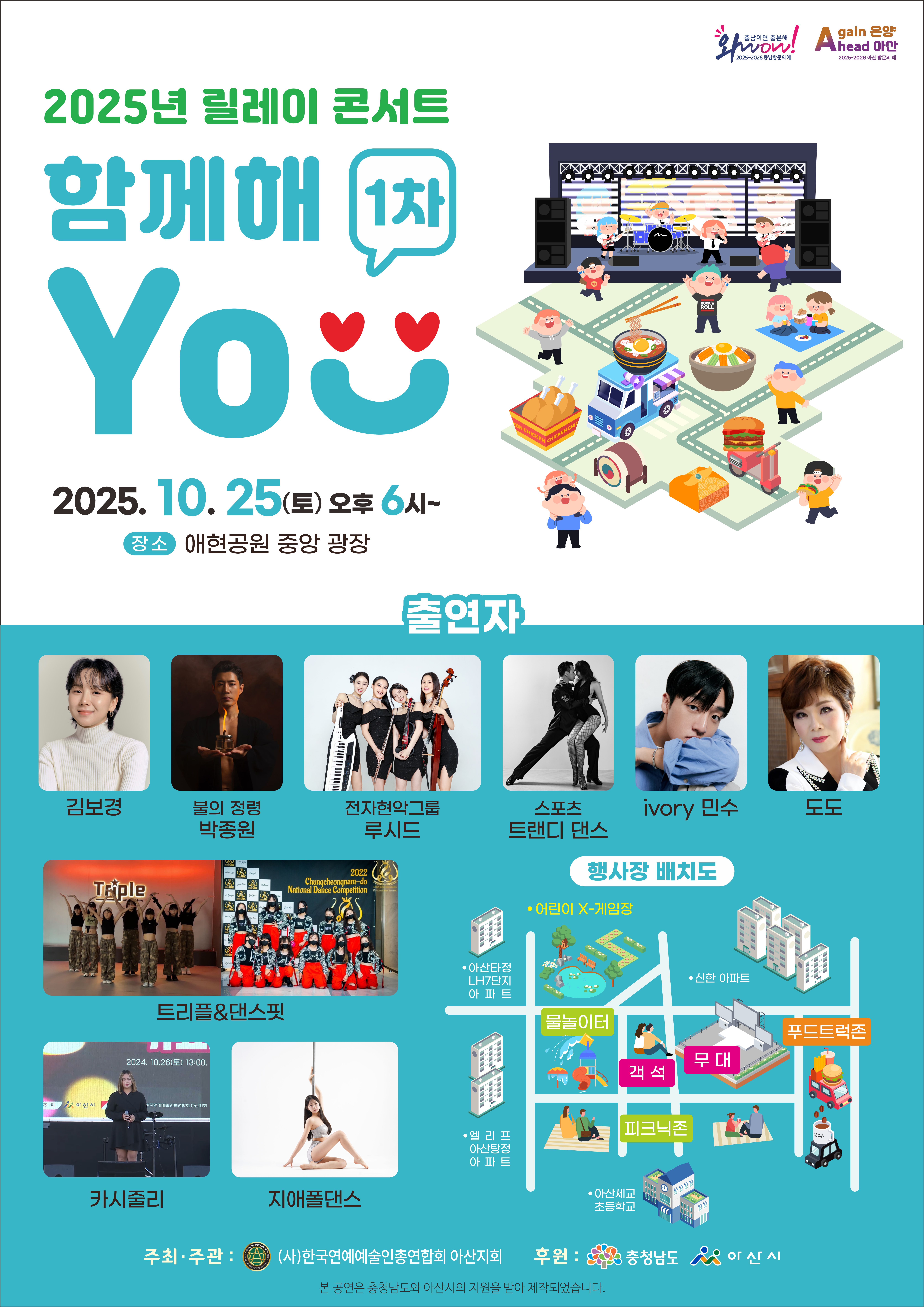 행사명 : 아산 릴레이 콘서트 “함께해You” 일 시 : 2025.10.25.(토) 오후 6시 장 소 : 애현 어린이공원 광장 출연진 : 김보경, 박종원, 루시드, 트랜디 댄스, 아이보리 민수, 도도, 트리플&댄스핏, 카시줄리, 지애폴댄스 문 의 : 041-540-2355