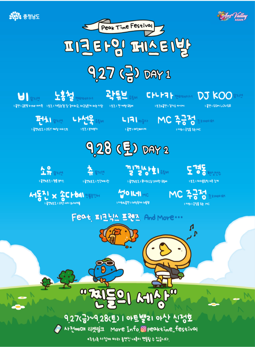 우리시에서는 청년의 날을 기념하여, 청년들을 응원하는 축제의 장 '2024 전국 청년축제 피크타임 페스티벌' 행사를 아래와 같이 개최합니다. 놀라운 라인업과 즐길거리, 먹거리, 볼거리가 가득한 '피크타임 페스티벌'에서 우리 함께 신나게 즐겨보아요!!! <행사개요> ○ 행 사 명 : 2024 전국 청년축제 '피크타임 페스티벌' ○ 행사일시: 2024. 9. 27.(금) 15:00 ~ 22:00 / 9. 28.(토) 13:00 ~ 19:00 (2일간) ○ 행사장소: 신정호 야외음악당, 잔디광장 ○ 행사내용: 뮤직페스티벌, 크리에이터 쇼, 청년정책마켓, 체험부스, 푸드트럭 등 ○ 라인업 - 9.27(금) DAY 1 : 비, 노홍철, 곽튜브, 다나카, DJ KOO, 펀치, 나선욱, 니키, MC 주긍정 - 9.28(토) DAY 2 : 소유, 츄, 낄낄상회, 도경동, 서동진x송다혜, 섭이네, MC 주긍정, Feat. 피크닉스 프렌즈 ○ 프로그램 - 청년일자리박람회, 청년빌리지존, 제로하이볼드링크존, 로컬푸드트럭존, 전국부캐왕선발대회, 고막남친고막여친 고음가요제, 청년공유마켓, 청년정책마켓