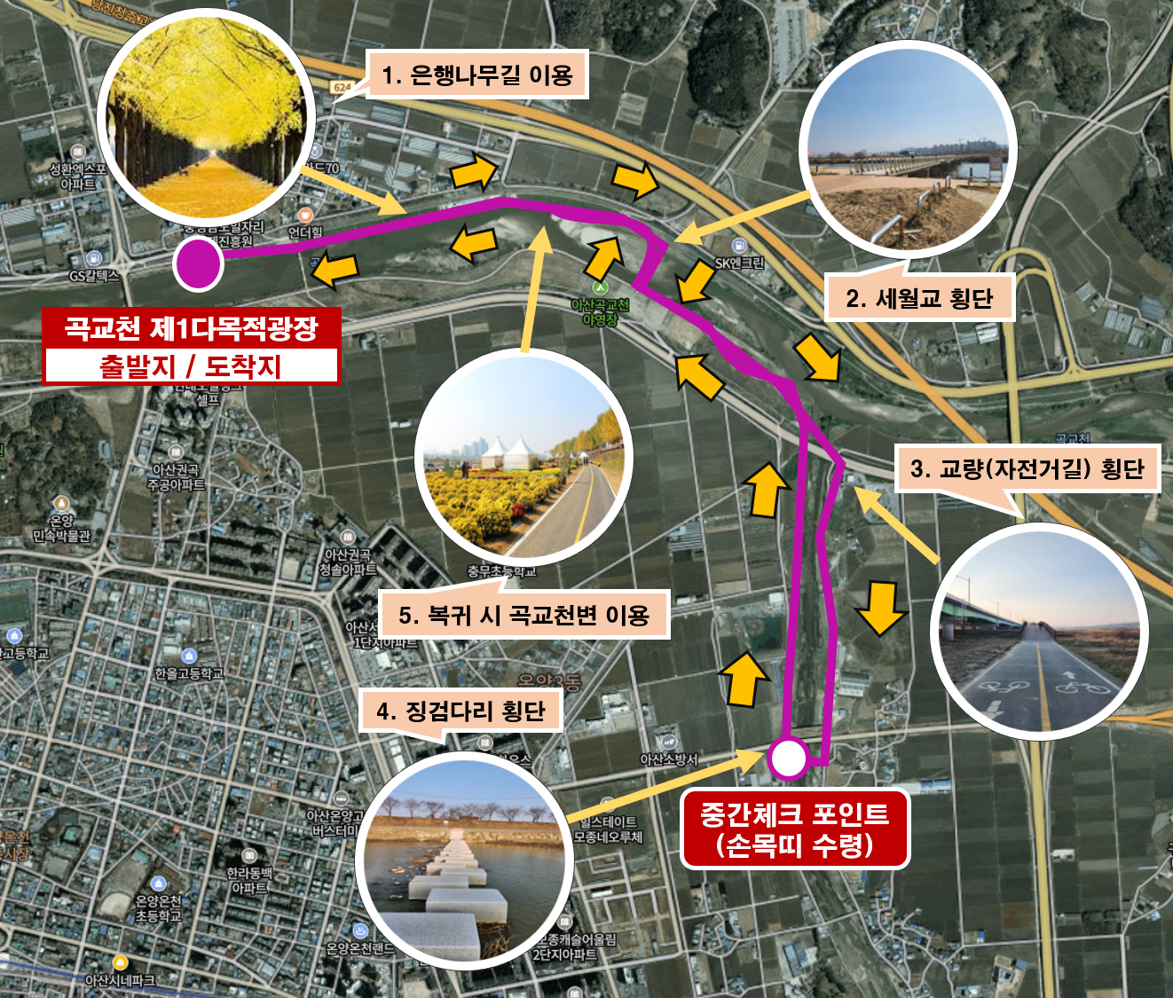 1. 걷기코스 곡교천 제1다목적광장(출발지) - 은행나무길 - 곡교천 제2다목적광장 - 세월교 횡단 - 온양천 산책로 - 징검다리 횡단(온양장로교회 인근) - 곡고쳔 제2다목적광장 - 곡교천변 산책로 - 곡교천 제1다목적광장(도착지) 2. 주차장 ※ 행사장 주변 주차 공간이 매우 협소하므로 곡교천 야영장을 이용해주시고, 가급적 대중교통을 이용해주시기 바랍니다. ※ 700, 702, 970, 971, 33번 버스 이용 가능(충남경제진흥원 하차)