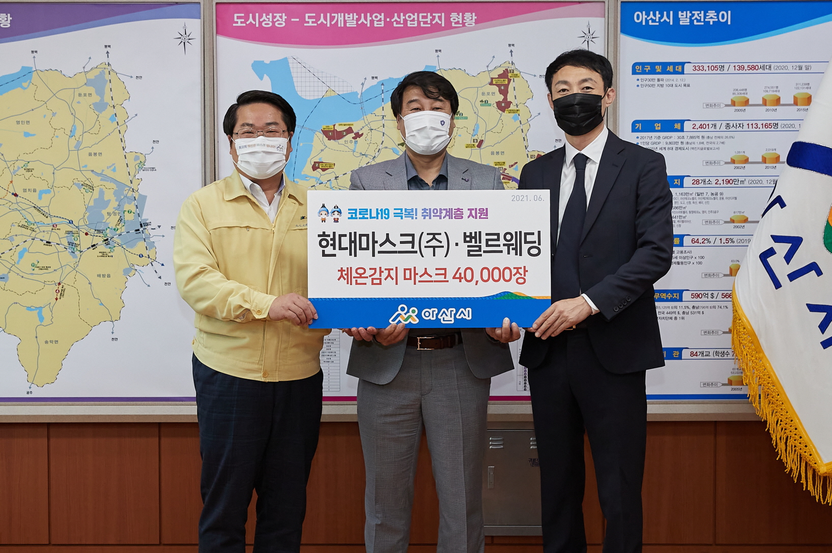현대마스크(주)(대표 장용석)와 벨르웨딩(대표 오기석)이 2일 아산시(시장 오세현)에 코로나19 확산 방지를 위한 사회취약계층 지원 체온 감지 마스크 4만 장을 쾌척했다.