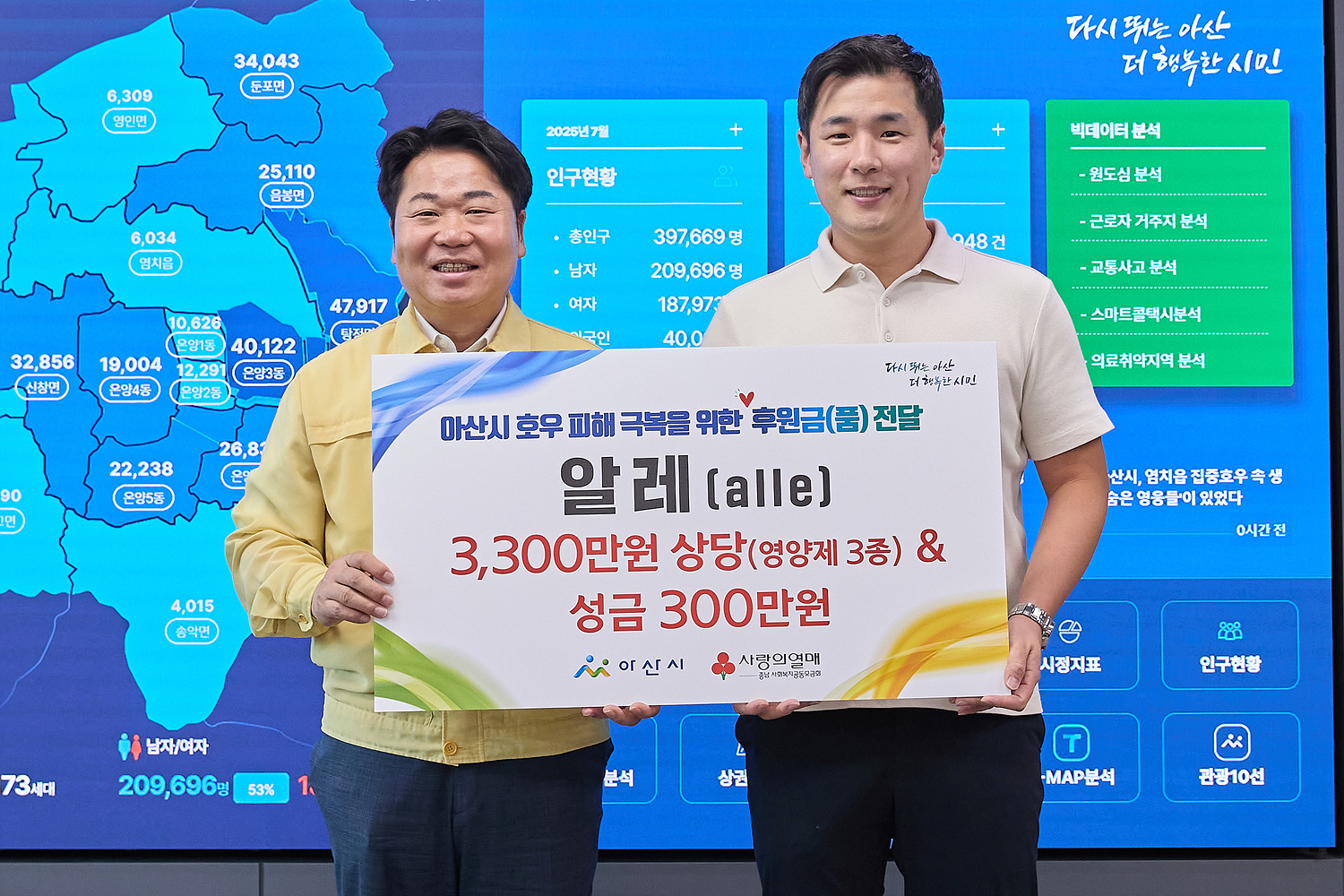 건강기능식품 전문기업 알레(ALLE)의 김시황 대표는 지난 8일 아산시(오세현 시장)를 방문해 집중호우 피해 지역 지원 성금 300만 원과 영양제 3종 3,300만 원 상당의 후원 물품을 전달했다.