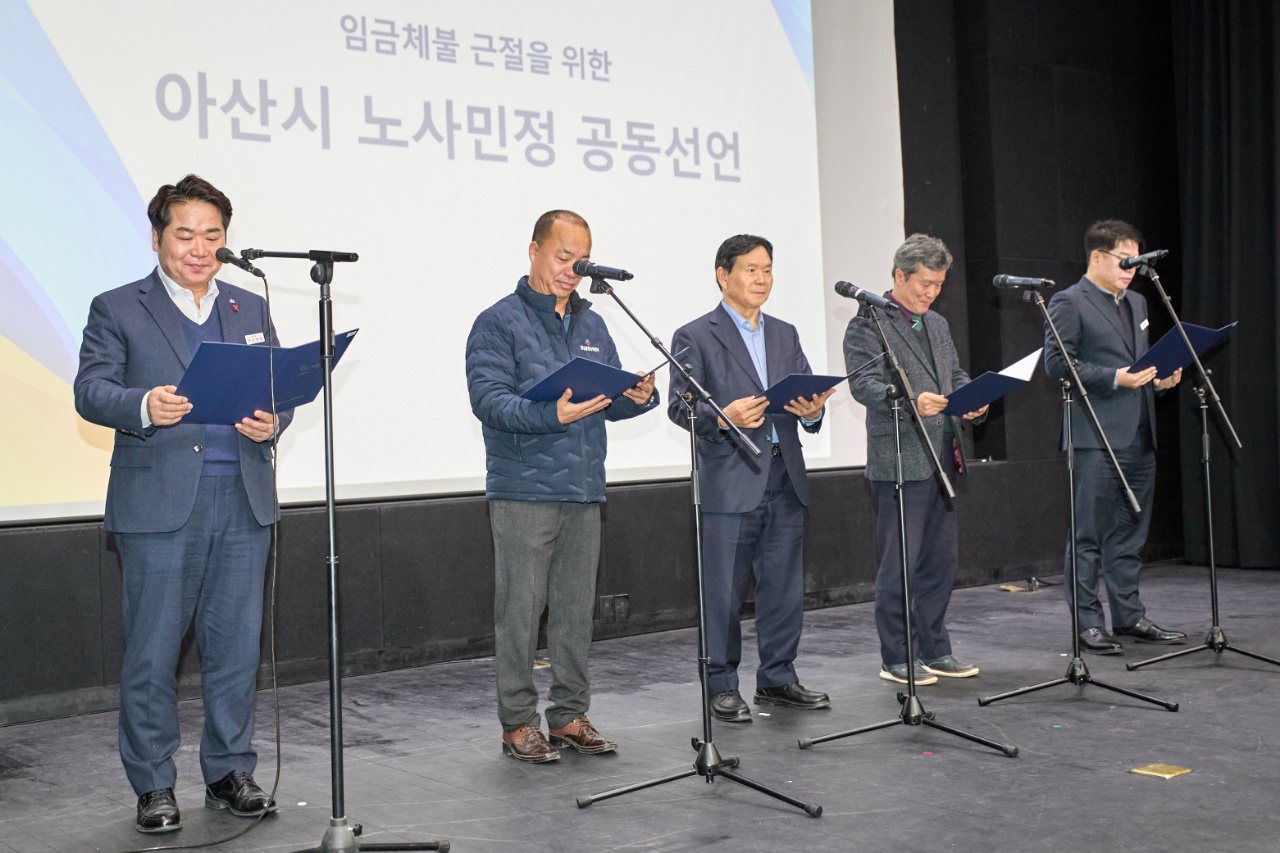 이와 함께 협의회는 ‘임금 체불 근절을 위한 아산시 노사민정 공동선언’을 발표했다. 공동선언에는 △관계 법령 준수 △임금의 적기 지급을 위한 관리체계 강화 △교육·홍보 확대 △지도·점검·모니터링 강화 △체불 발생 시 신속하고 엄정한 조치 및 피해 노동자 구제 지원 △지역 단위 협력체계 구축 등의 실천 과제가 담겼다.