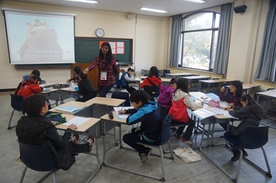 원어민이 주말영어 방과후 수업에서학생들을 가르치는 모습
