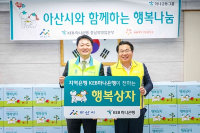 KEB하나은행 충남북영업본부(충남북지역 대표 김태범)는 10월 22일 아산시(시장 오세현)에 저소득층 이웃을 위한 사랑의 ‘행복상자’를 전달했다.
