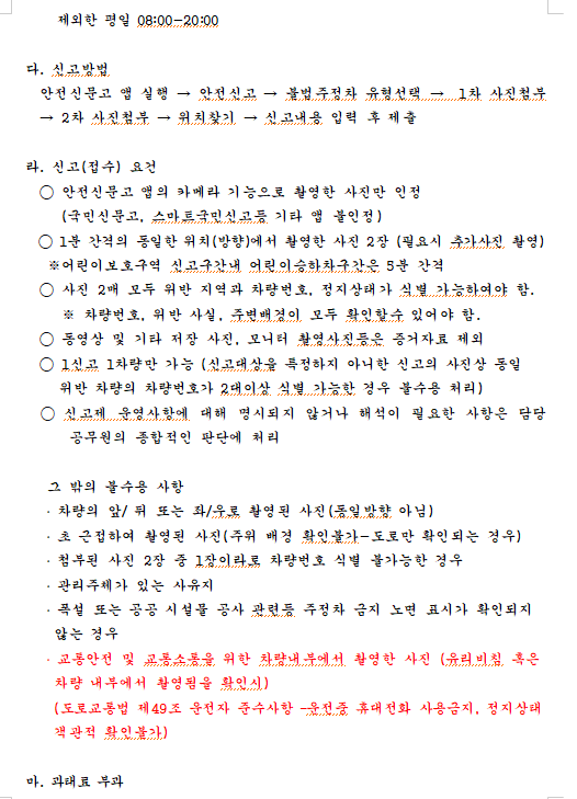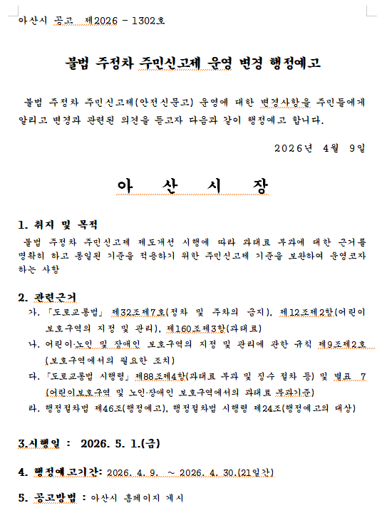 불법 주정차 주민신고제 운영 변경에 따른 지역주민 및 이해관계자들의 의견을 수렴하기 위하여 행정절차법 제46조에 따라 행정예고 하오니