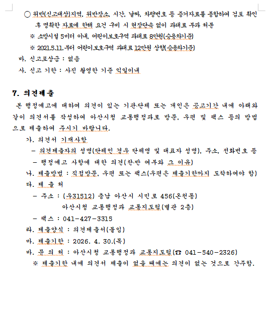 행정예고 내용과 관련한 의견이 있을 경우에는 기간 내에 충청남도 아산시 교통행정과로 의견서를 제출하여 주시기 바랍니다.